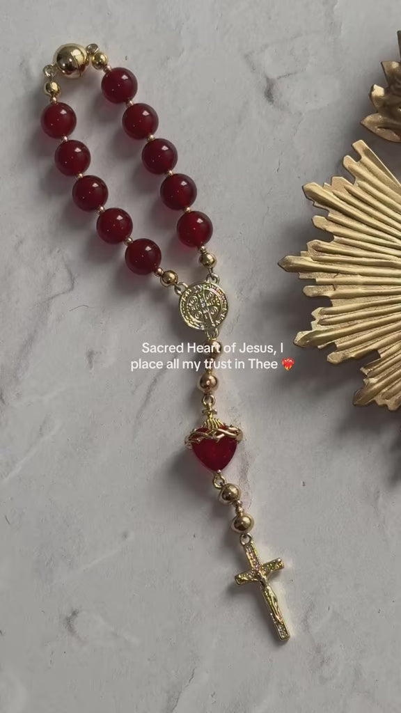 The rosary features rich red jade gemstone beads paired with an 18 karat gold plated Sacred Heart pendant and crucifix. The deep red tones honor the Sacred Heart of Jesus and symbolize love, sacrifice, and devotion.